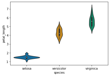 sns.violinplot(x="species", y="petal_length", data=train, size=5, order = cn, palette = 'colorblind');