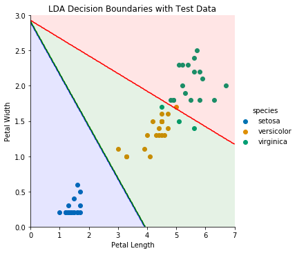为了在二维可视化决策边界,我们可以仅使用花瓣的LDA模型,并绘制测试数据:
