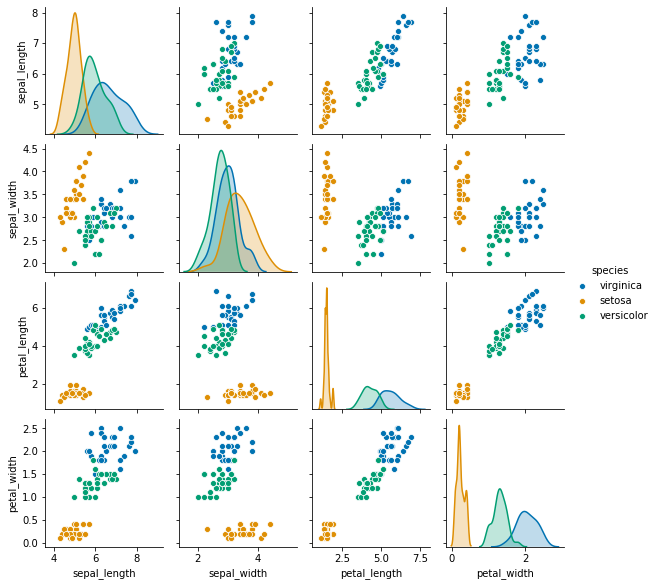 sns.pairplot(train, hue="species", height = 2, palette = 'colorblind');