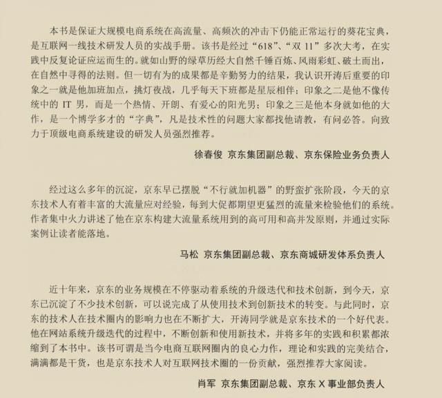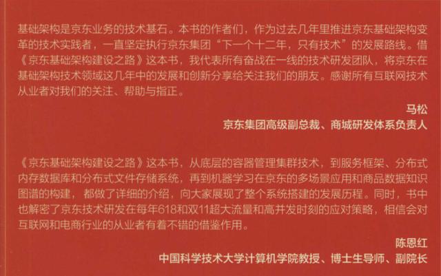 本书内容涵盖容器集群、数据库、分布式存储、服务框架、消息队列、异地多活、机器学习等一系列经典技术话题, 深入浅出地向读者展示了京东基础架构的搭建、 演进、变革及发展的完整画像,系统地阐述了京东重要阶段的技术进步历程及里程碑级别的技术突破,堪称是一部“从入门到精通”的基础架构经典教材。
