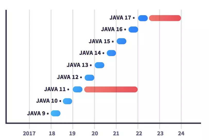 相反,他们说每三年会有一个“长期支持的版本”(Long Term Support release,简称LTS),该版本会提供为期三年的支持。Java 8是一个LTS,当前的LTS是Java 11,下一个应该是Java 17。