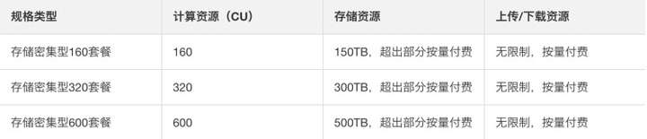 - 当预估企业客户未来一段时间的数据存储总量比较大(100TB以上)、计算任务少(计存比小于1.5),选择阿里云的固定套餐资源;