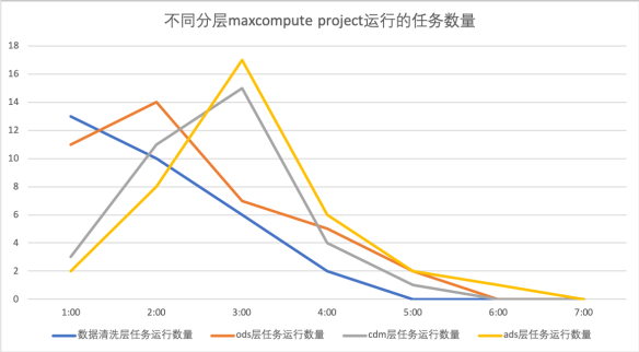 比如笔者这边的项目情况如下:数据清洗层因为涉及很多业务系统原始数据表的join操作,非常消耗CU资源;ods层经常是导入清洗之后的数据即可,不需要消耗太多资源;cdm层规范建模,任务运行方法比较固定,因为我们在数据清洗层已经将数据做规范化处理,因此cdm层消耗的CU资源也很少;最后,将cdm的派生指标融合进ads层,需要做很多复杂的join操作,因此消耗的CU资源非常多。并且,从晚上1点到凌晨7点之间,这四个层次对应的项目运行消耗的资源量呈现“错峰”情况。下图是我们在进行测试环节统计的情况: