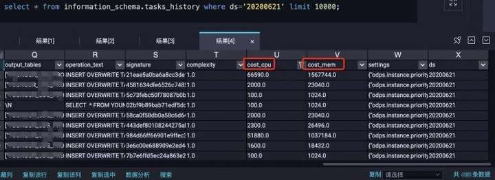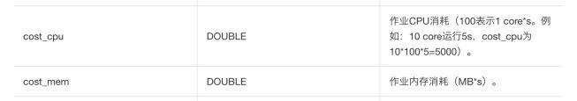 详细介绍如何开通和查看MaxCompute的information_schema信息。MaxCompute元数据表有很多,本文只需要利用到一张表:TASKS_HISTORY。这张元数据表记录了所有MaxCompute 计算任务的资源消耗情况。详细介绍元数据表TASKS_HISTORY的字段信息,其中最重要的字段信息是:cost_cpu 和 cost_mem,分别表示: