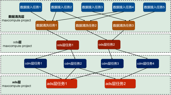 对于很多企业客户,使用DataWorks/Dataphin需要做任务调度。任务调度就必然有父子任务关系。比如笔者在本文列举的实际案例,对于数据中台项目,划分了8个MaxCompute project,分别是:数据清洗的两个project、ods贴源层的两个project、cdm公共层的两个project、ads应用层的两个project。每个project分配一个独立的quota group子资源组。数据分层有严格的先后顺序:数据清洗的任务是ods层任务的父任务;ods层任务是cdm层任务的父任务;cdm层任务是ads层任务的父任务,他们之间的任务调度关系如下所示: