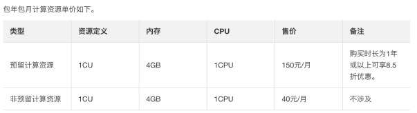 项目开发完成,正式进入到上线阶段,建议购买包年包月的计算资源CU配额,因为是固定的CU配额,不会在阿里云公共计算资源池去抢占计算资源,可以顺利地为企业客户预留足够的CU资源。计费方式如下所示: