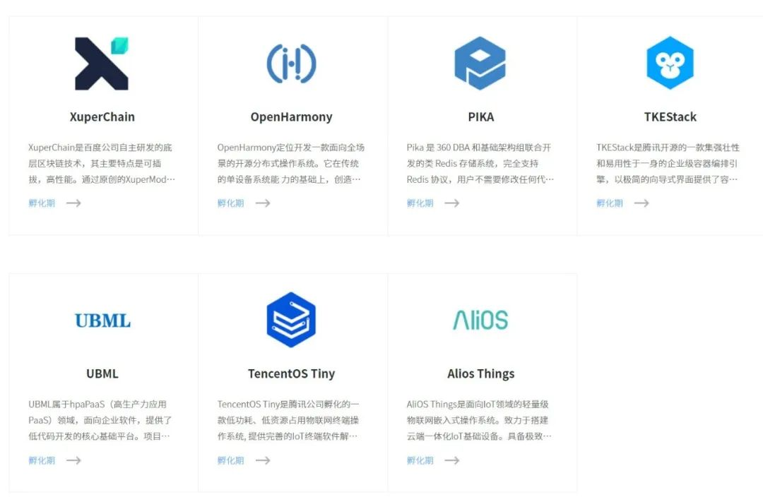 网站显示最新孵化的项目有 7 个,除了鸿蒙之外,百度超级链 XuperChain、360 的类 Redis 存储系统 Pika、腾讯的 Kubernetes 发行版 TKEStack 和物联网终端操作系统 TencentOS tiny 、浪潮的低代码开发平台 UBML,以及物联网嵌入式操作系统 AliOS Things 等项目。