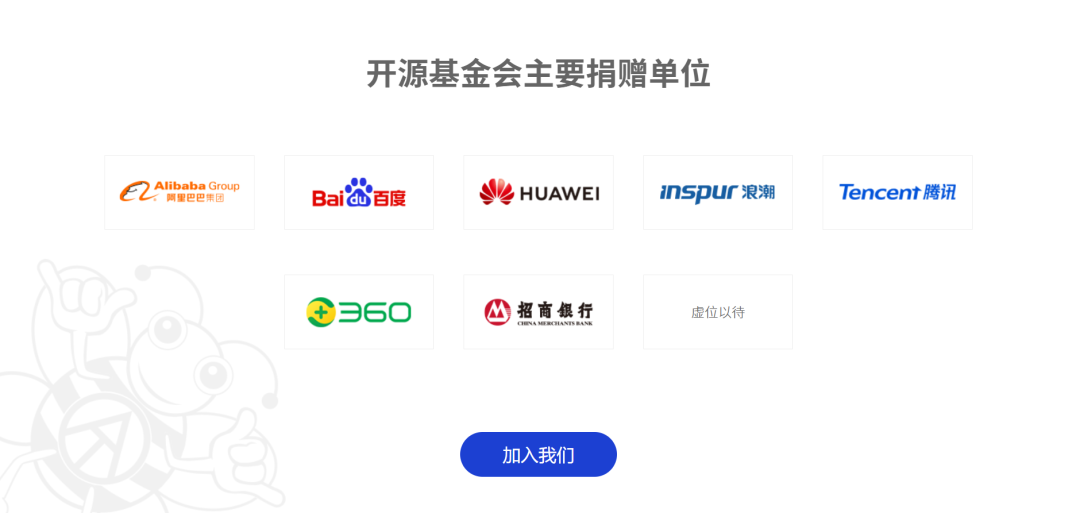 现阶段,该基金会的主要捐赠单位有七家,分别是:阿里巴巴、百度、华为、浪潮、腾讯、360 和招商银行。