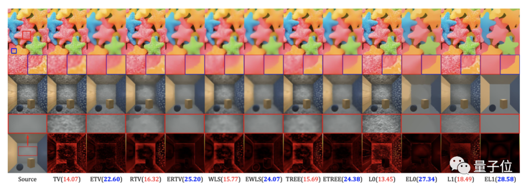 另外,使用PSNR(峰值信噪比)指标,对几种不同的平滑方法进行对比。结果表明,基于EAP的方法PSNR值明显高于其他方法,也就是说,实现了更彻底的纹理分解。