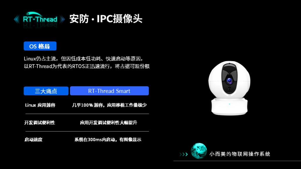 RT-Thread Smart主要面向安防、车载、工业、军工等行业应用。以安防中的IPC摄像头为例:Linux仍占主流,但因低成本低功耗、快速启动等原因,以RT-Thread为代表的RTOS正迅速流行,而RT-Thread Smart几乎可以实现Linux应用100%兼容,应用移植工作量极少。并且RT-Thread Smart应用开发调试便利性大幅提升,而且启动时间也可以控制在300毫秒内,有图像显示,更加契合IPC摄像头的现实需要。