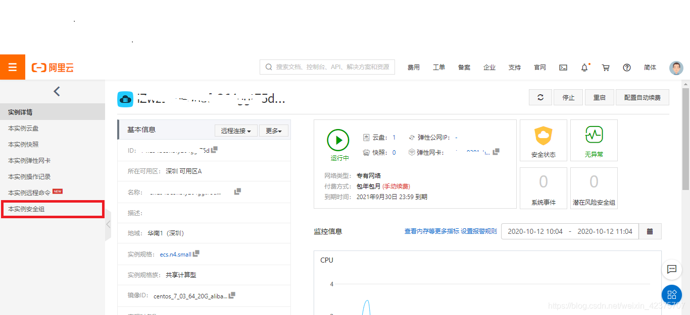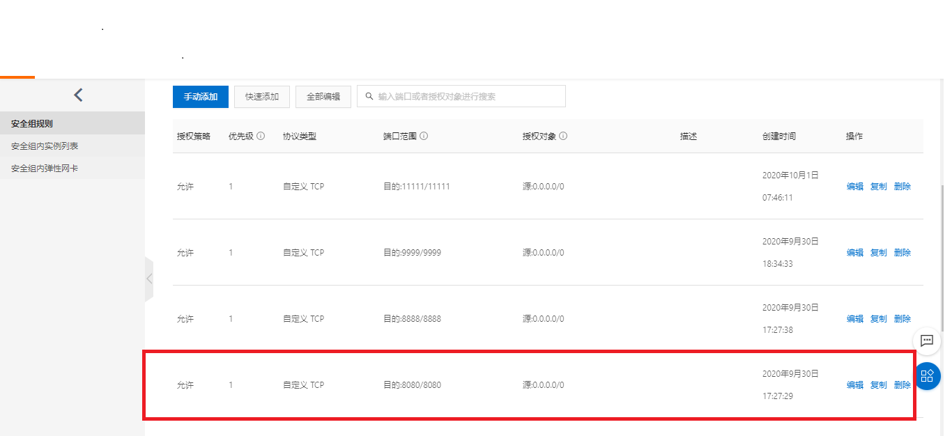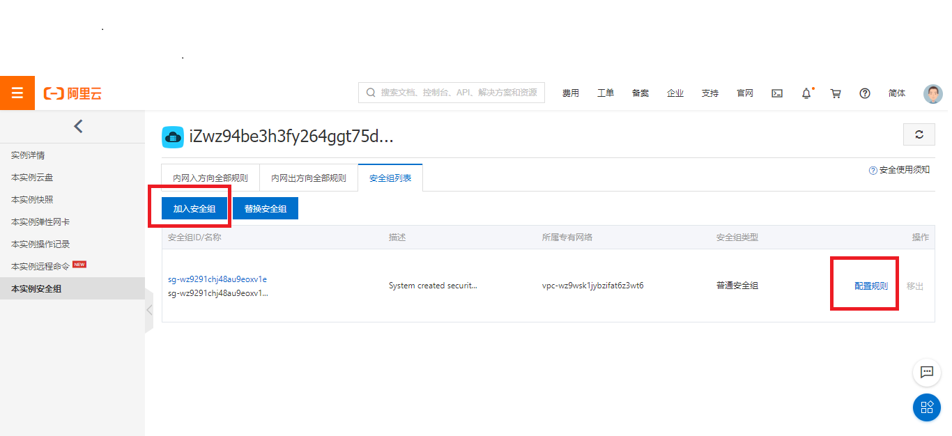 默认情况下会有安全组,如果安全组存在,直接点击配置规则进去添加允许通过的端口号即可,如果没有安全组,则点击加入安全组即可!
