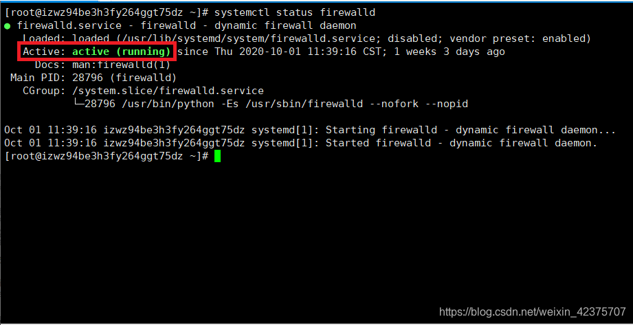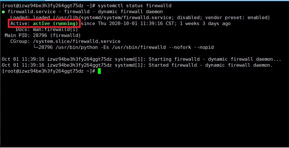 # 查看firewall服务状态, active(running)代表正在开启,inactive(dead)代表已关闭systemctl status firewalld