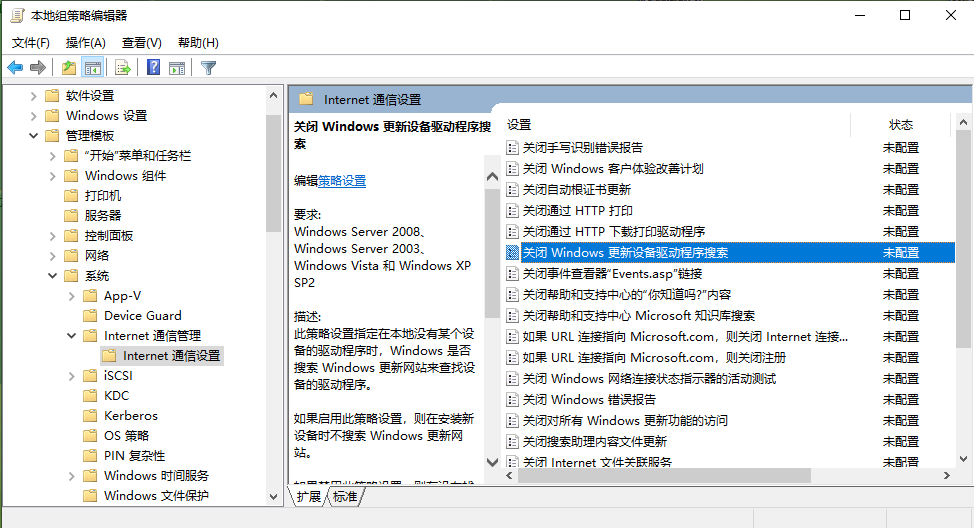 2. 进入本地计算机策略界面后,依次选择:管理模板->系统->Internet通道管理;在右侧找到 关闭windows更新设备驱动程序搜索;