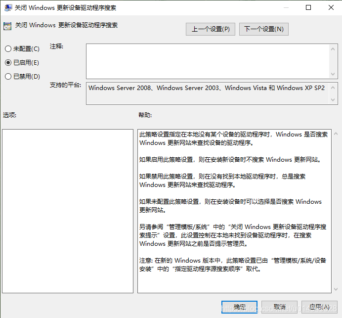 3. 双击 关闭windows更新设备驱动程序搜索;选择 已启用。