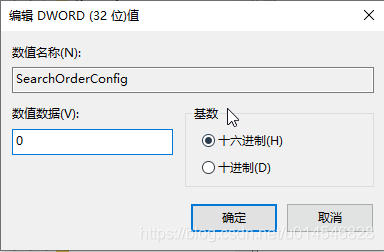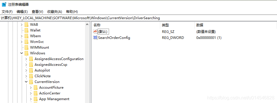 3. 双击 右侧的 SearchOrderConfig;默认的键值为1,如果要关闭禁用自动更新驱动,这里需要将 键值改为 0 即可。