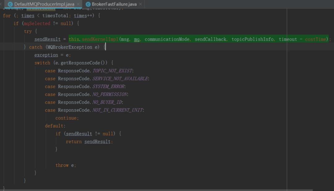 从这里可以看出 RocketMQ 消息发送高可用设计一个非常关键的点,重试机制,其实现是在 for 循环中 使用 try catch 将 sendKernelImpl 方法包裹,就可以保证该方法抛出异常后能继续重试。从上文可知,如果 SYSTEM_BUSY 会抛出 MQBrokerException,但发现只有上述几个错误码才会重试,因为如果不是上述错误码,会继续向外抛出异常,此时 for 循环会被中断,即不会重试。