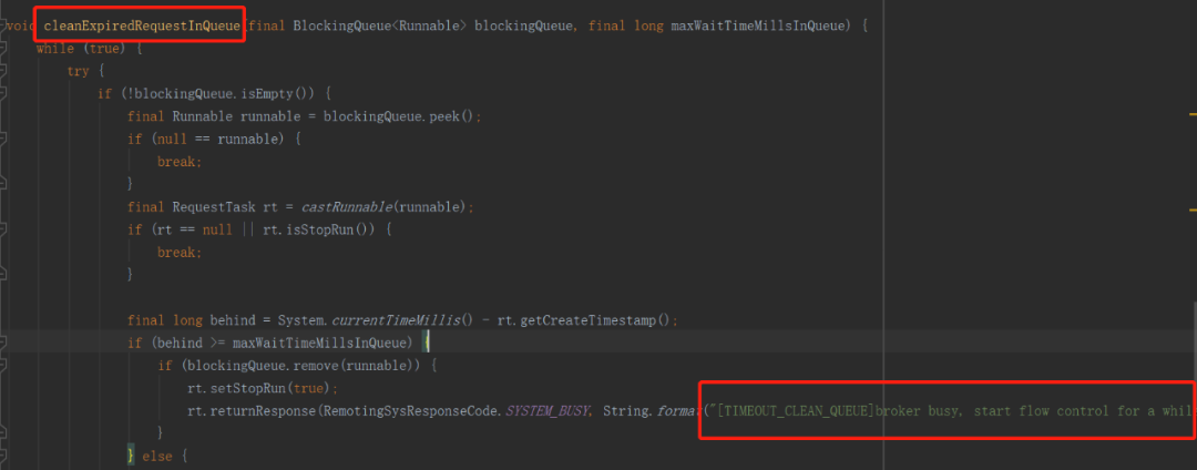 首先我们根据关键字:TIMEOUT_CLEAN_QUEUE 去 RocketMQ 中查询,去探究在什么时候会抛出如上错误。根据全文搜索如下图所示: