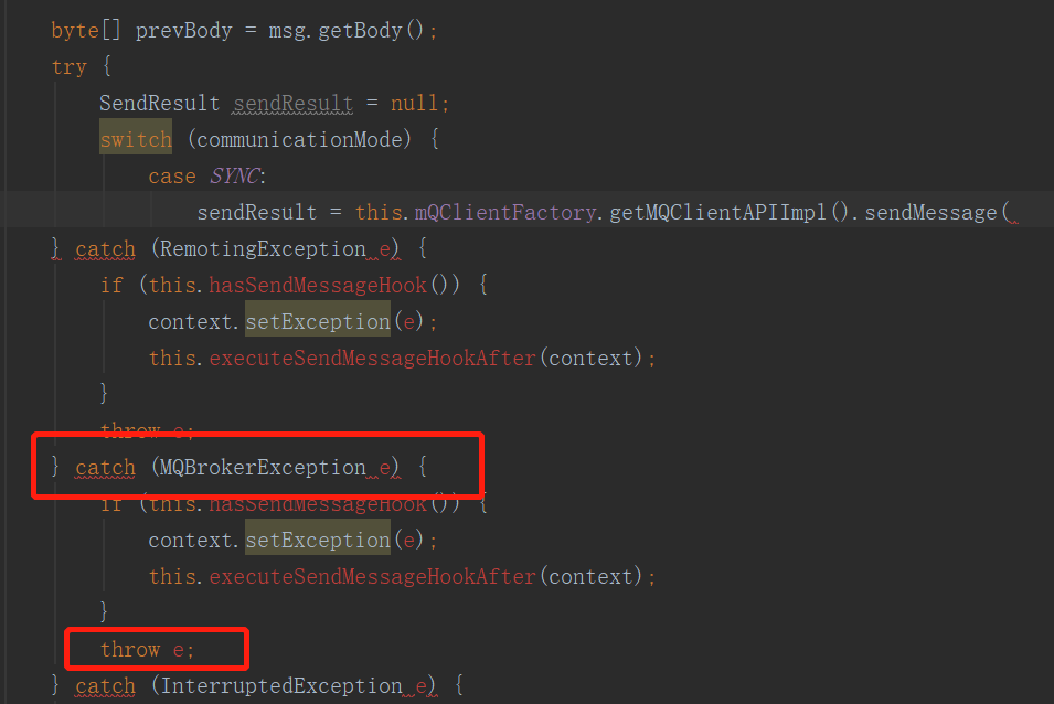 可以看出在 sendKernelImpl 方法中首先会捕捉异常,先执行注册的钩子函数,即就算执行失败,对应的消息发送后置钩子函数也会执行,然后再原封不动的将该异常向上抛出。