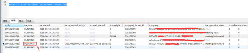 图中红色语句 LOCK WAIT为占用系统资源的语句,我们需要杀掉这个锁,执行 kill 线程id号。上面这条记录的id为199120823069, trx_mysql_thread_id 为 738178711, 所以我们执行:kill 738178711杀掉这个MySQL语句的线程即可。