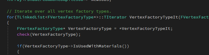 b. 获取所有顶点工厂类型,对于每一种顶点工厂类型,查看该类型对应的ShaderMap是不是已经被使用,如果被使用就去BeginCompile。