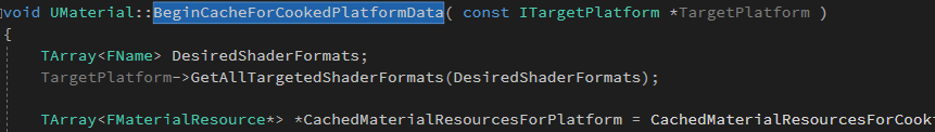 1)Cook Commandlet会首先调用一个Package里面所有的UObject的BeginCacheForCookedPlatformData(const ITargetPlatform *TargetPlatform)方法,该方法由各个UObject派生类各自实现,目的是生成特定所需数据并缓存下来,对于材质来讲就是UMaterial的BeginCacheForCookedPlatformData。
