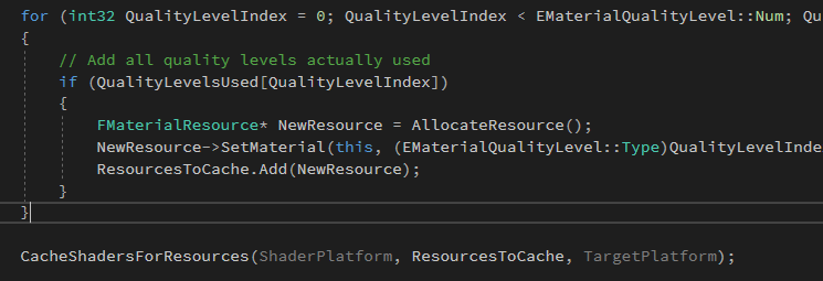 b. 为当前ShaderFormat/FeatureLevel、QualityLevel生成一个FMaterialResource数组,并调用CacheShadersForResources填充其内容。