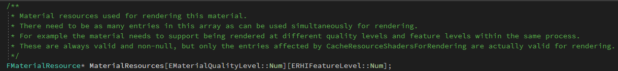 结合之前的分析,不难得出UMaterial持有QualityLevelNum * FeatureLevelNum个FMaterialResource,可以通过QualityLevel和FeatureLevel索引到FMaterialResource。