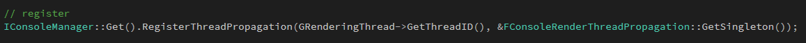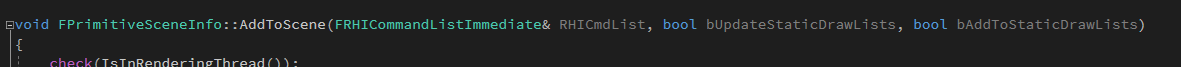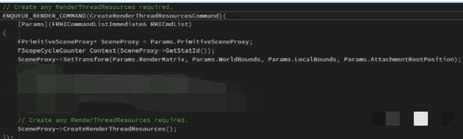 具体代码调用实例如下,这个宏是在游戏线程中调用的,有时候游戏线程中有一些资源发生了变动,或者添加了一些新的资源,抑或是因为一些逻辑而要去改到渲染线程的一些操作,都需要有一种方法去通知到渲染线程,就像是两艘并行飞驰的船,各自走自己的路,另一艘船上发生了什么是完全不知道的,而UE4就通过设置一系列宏为两艘船之间的通信提供了方法。