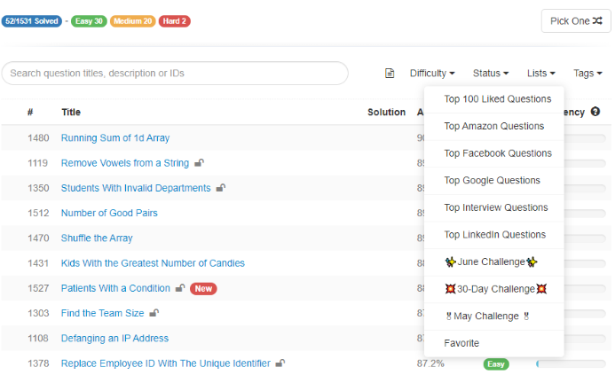 例如,LeetCode可以通过特定的公司以及频率筛选顶尖的面试问题。你也可以选择自己觉得合适的试题难度(简单、中等、困难):