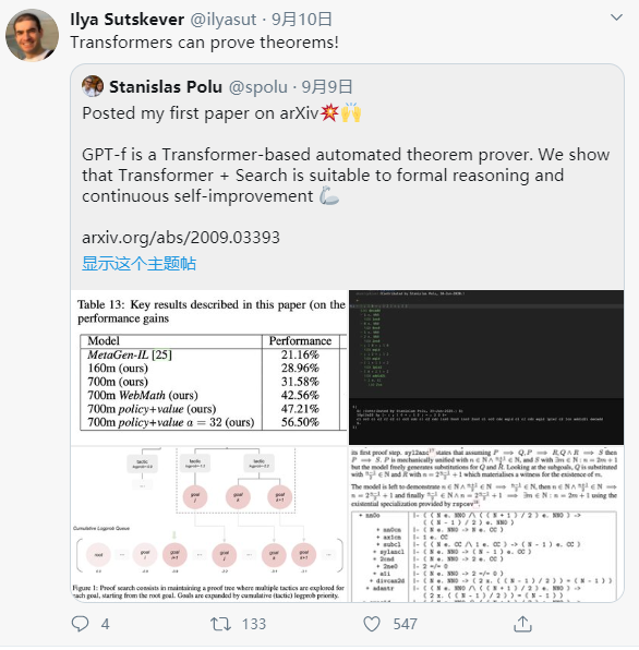 日前,OpenAI 研究者Stanislas Polu和Ilya Sutskever在社交媒体发布消息,宣布在预印本发布文章,展示了一个基于Transformer 的自动定理证明模型。文章表示,团队在 Metamath 库上取得了新的进展,通过将深度学习和形式系统相结合能带来更好的效果。