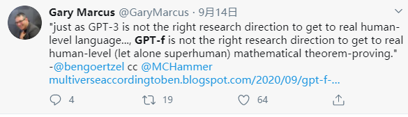 对于 GPT 模型,很多人并不乐观,像此前一直对 GPT 开炮的 Gary Marcus, 在社交媒体上一直置顶自己在《MIT 科技评论》上面批判 GPT 的文章,文中批评了 GPT 在面对数学等基础学科上的无知和无能,称其根本一文不值,只是一个了解上下文的机器而已。此次更是快速反应, 称 GPT-f 也一样达不到人类的水平,更不用说打败人类了。