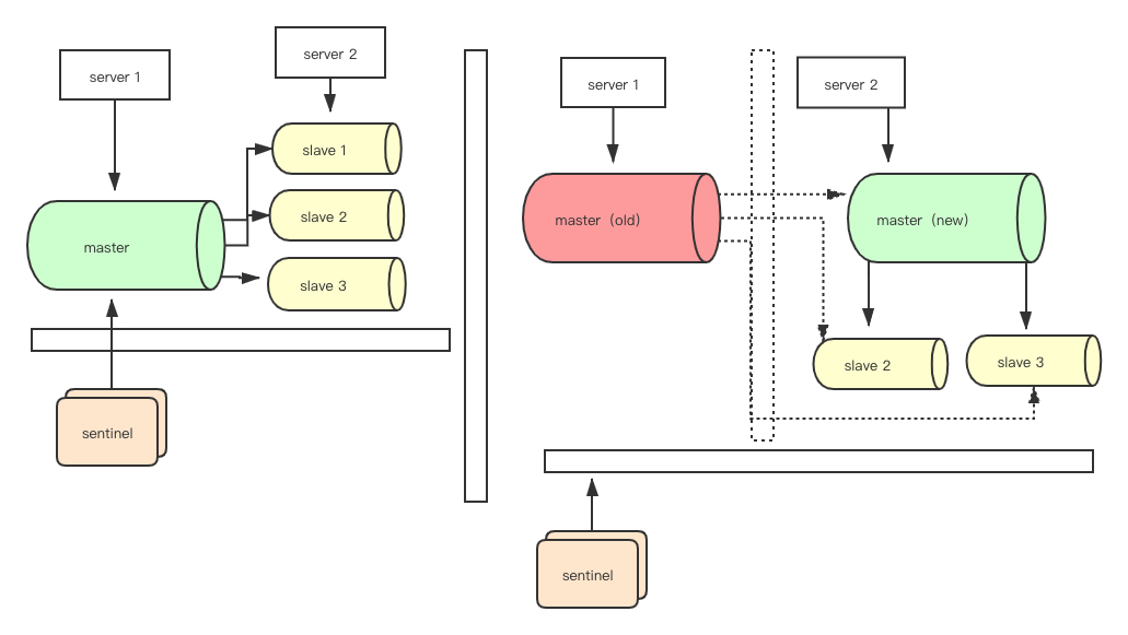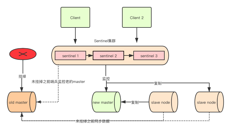 脑裂就是说,某个maser 所在机器突然脱离了正常的网络,跟其他slave机器不能连接,但是实际上master还运行着,此时哨兵可能就会认为master 宕机了,然后开启选举,将其他slave切换成了master,这个时候,集群里面就会有2个master,也就是所谓的脑裂,此时虽然某个slave被切换成了master,但是可能client还没来得及切换到新的master,还继续写向旧master的数据可能也丢失了,因此master再次恢复的时候,会被作为一个slave挂到新的master 上去,自己的数据将会清空,重新从新的master 复制数据