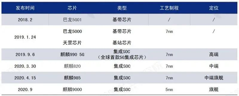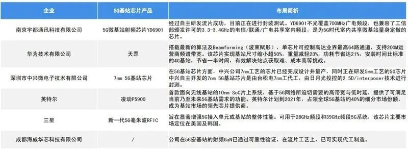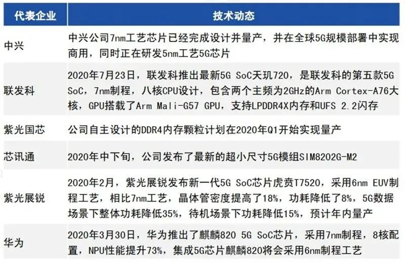 从国内5G芯片代表企业的发展情况看,主要以7nm的量产及以6nm和5nm为代表的更小制程的研发为主。