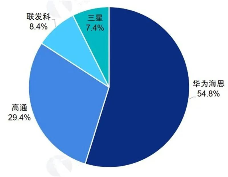 IDC数据显示,2020年二季度华为海思麒麟芯片超越高通、联发科,在中国5G手机芯片领域所占市场份额达到54.8%,高通和联发科,在中国5G手机芯片市场所占市场份额分别为29.4%、8.4%。而在2019年的中国5G芯片市场,高通还牢牢霸占着第一的位置,所占市场份额达到41%,华为海思份额只有14%。