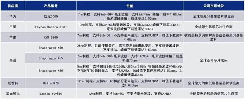 目前手机使用的基带芯片大多数为高通 X50,支持 NSA 的组网方式,同时支持 NSA 和 SA 组网方式的 X55 将于 2020 年商用。华为的巴龙5000 只用于自家发布的 5G 手机,同时支持 NSA 和 SA 的组网方式。苹果和三星也在积极推进自家 5G 基带芯片的研发和商用进程。