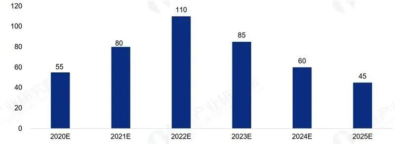 ▲2020-2025年中国新建5G基站数量预测(单位:万个)
