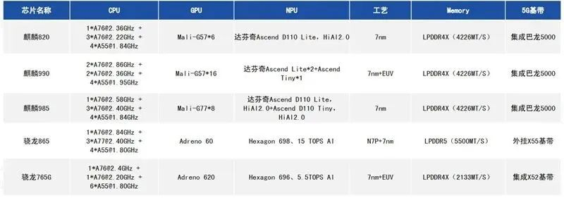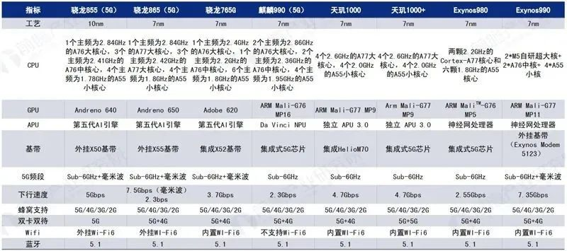 5G基带需要支持不同5G频段,并且由于5G追求更高的数据数据吞吐量,更低的时延和更大的网络容量,5G基带需要兼顾极高的下载和上传速度,因此5G基带/AP芯片设计难度较大。另外,由于性能和功耗要求,5G芯片通常采用先进工艺制程。目前已经发布的主要5G芯片平台包括华为的麒麟990、麒麟985,高通骁龙865,联发科天玑1000系列等,大部分采用了7nm制程。
