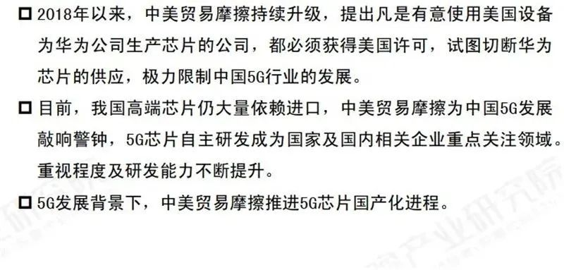 目前,我国高端芯片多依赖进口,2018年以来中美贸易摩擦持续升级,美国通过切断核心领域5G芯片的供应,遏制中国5G行业的发展,为5G芯片国产化的发展敲响警钟,推动芯片国产化进程 。