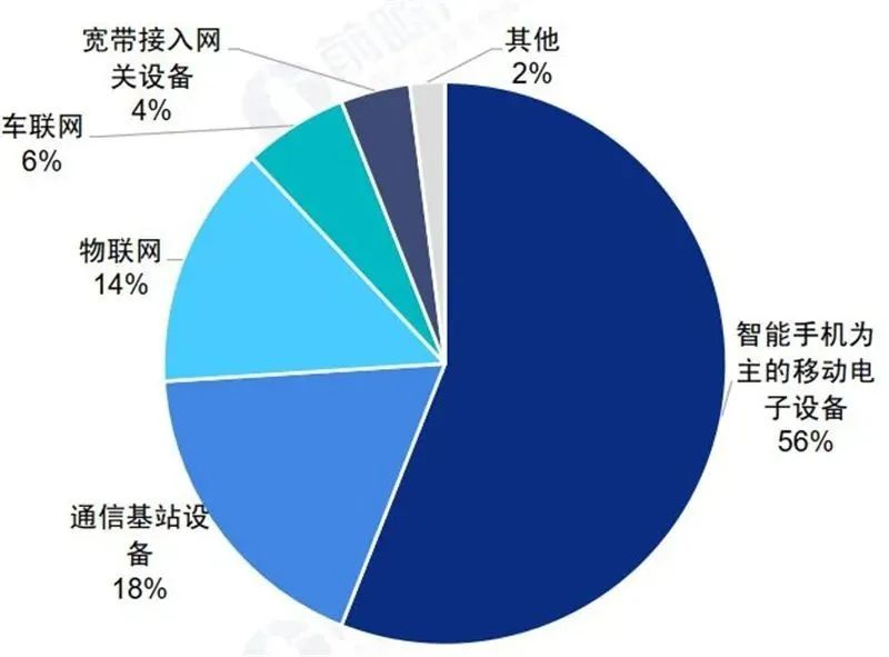 根据Grand View Research的数据,2019年,以智能手机为主的移动电子设备占据了5G芯片市场规模56%的份额;其次为5G基站设备,受益于5G基础网络设施的持续投资,目前占据了18%的市场份额;物联网领域占据了14%的市场份额;车联网领域占据了6%的市场份额。