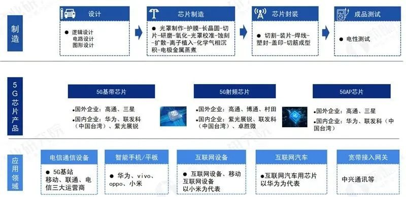 5G芯片产业链分为电路设计、芯片制造以及封装与测试三个环节,在芯片制造及封装领域我国竞争优势明显。