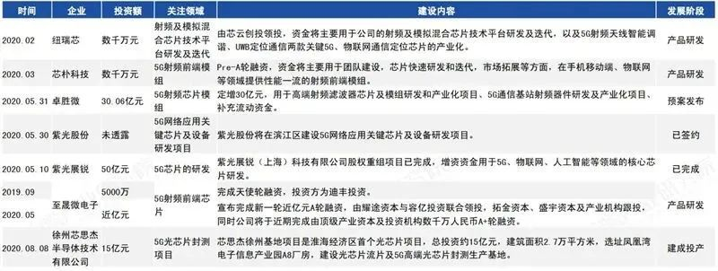 5G商用化的发展激发了对5G芯片核心部件的需求,在技术快速推进的同时,也获得了资本的高度重视。5G芯片代表性企业紫光展锐与2020年5月10日进行股权项目,增资50亿元,用于5G、物联网、人工智能等领域的核心芯片研发。而2020年初5G芯片其他企业获得融资的关注领域看,主要集中在5G射频芯片模组等领域。