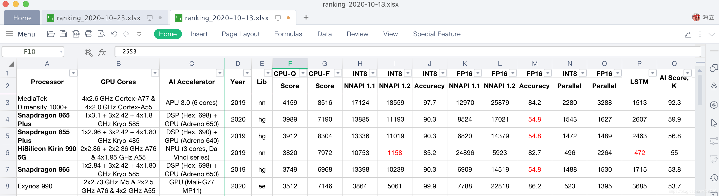 在《AI Benchmark v4榜首风云:天玑1000+ vs 麒麟990 5G》【2020-10-6】和本文【2020-10-23】之间一直在关注榜单和具体变化,举例看一下中间(2020-10-13)笔者所保留的数据: