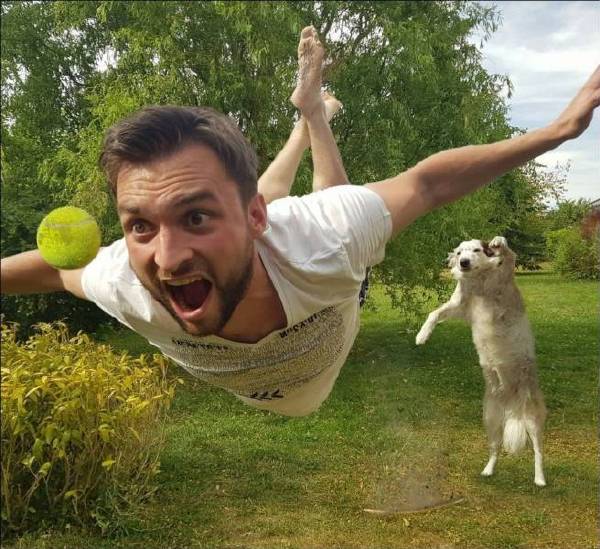 “和狗狗灵魂对换的@Xiaoshiyue 很无奈每天还是得陪用自己身体的狗狗玩接球游戏。”