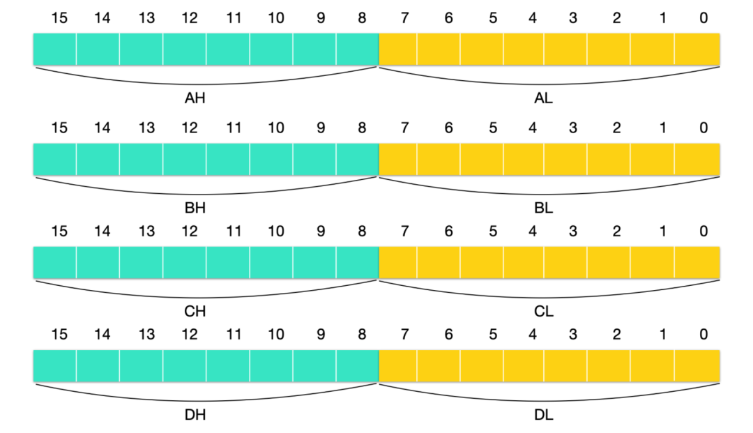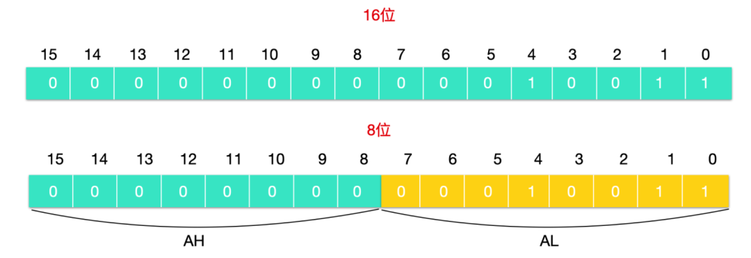 AX 的低位(0 - 7)位构成了 AL 寄存器,高 8 位(8 - 15)位构成了 AH 寄存器。AH 和 AL 寄存器是可以使用的 8 位寄存器,其他同理。