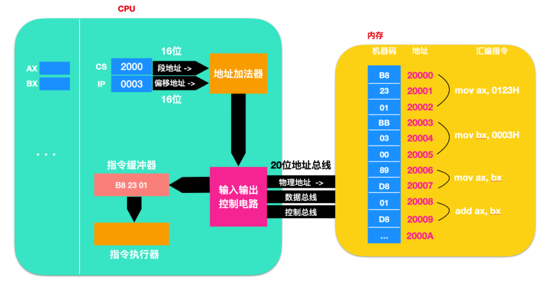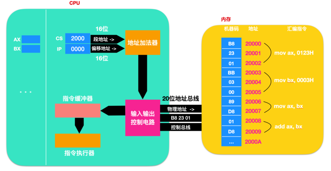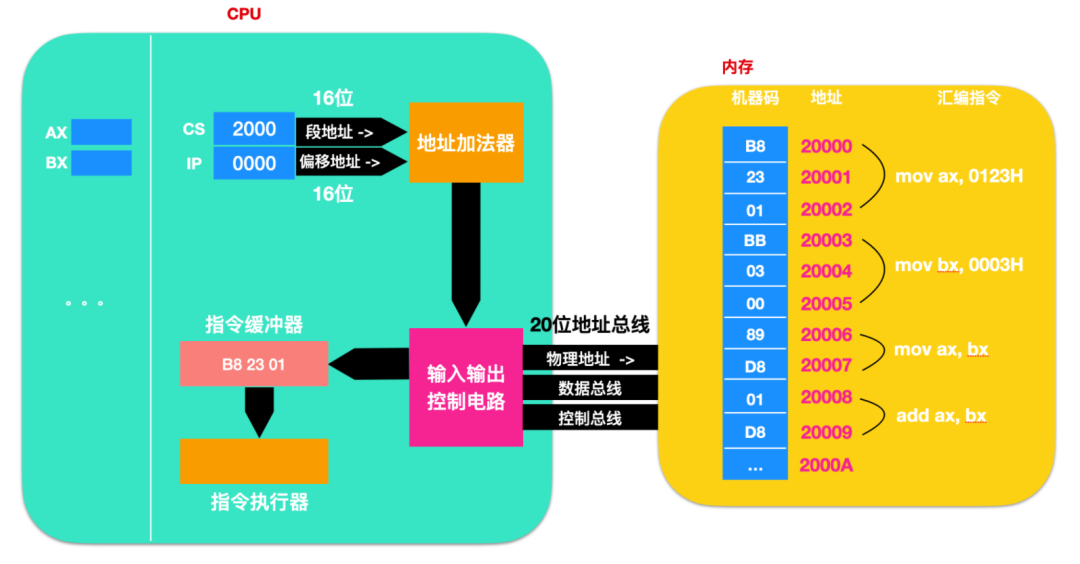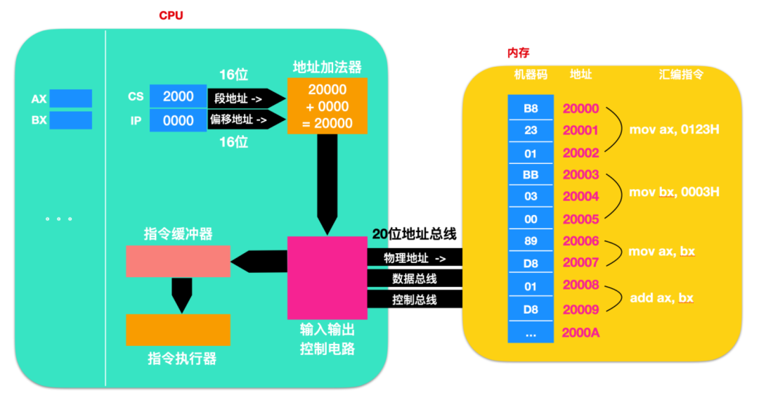 在 CPU 内部,由 CS、IP 提供段地址,由加法器负责转换为物理地址,输入输出控制电路负责输入/输出数据,指令缓冲器负责缓冲指令,指令执行器负责执行指令。在内存中有一段连续存储的区域,区域内部存储的是机器码、外面是地址和汇编指令。