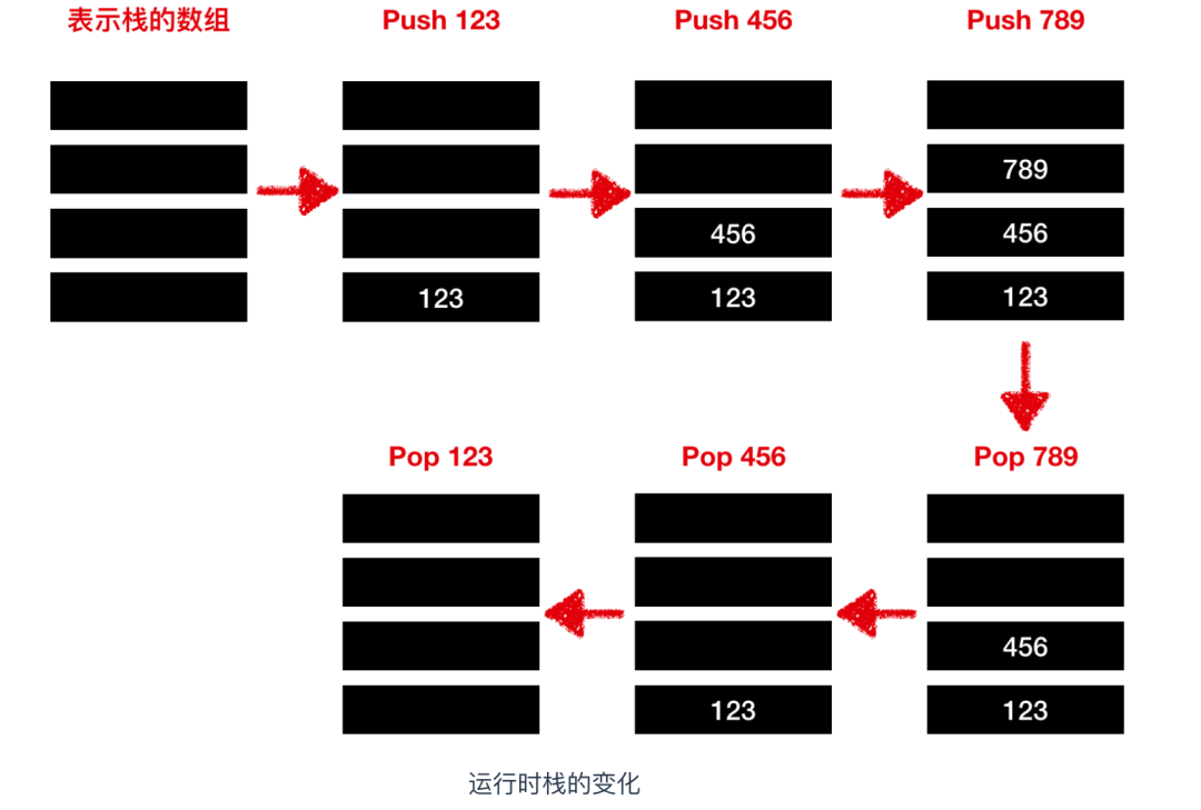 在栈中,LIFO 方式表示栈的数组中所保存的最后面的数据(Last In)会被最先读取出来(First Out)。