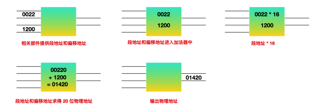 上面这幅图的段地址和偏移地址分别是 2000 和 0000,当这两个地址进入地址加法器后,会由地址加法器负责将这两个地址转换为物理地址