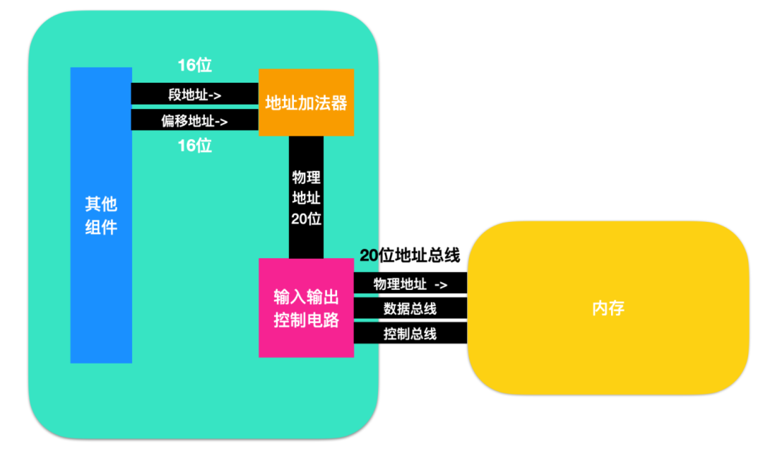 由地址加法器计算出物理地址通过输入输出控制电路将物理地址送到内存中