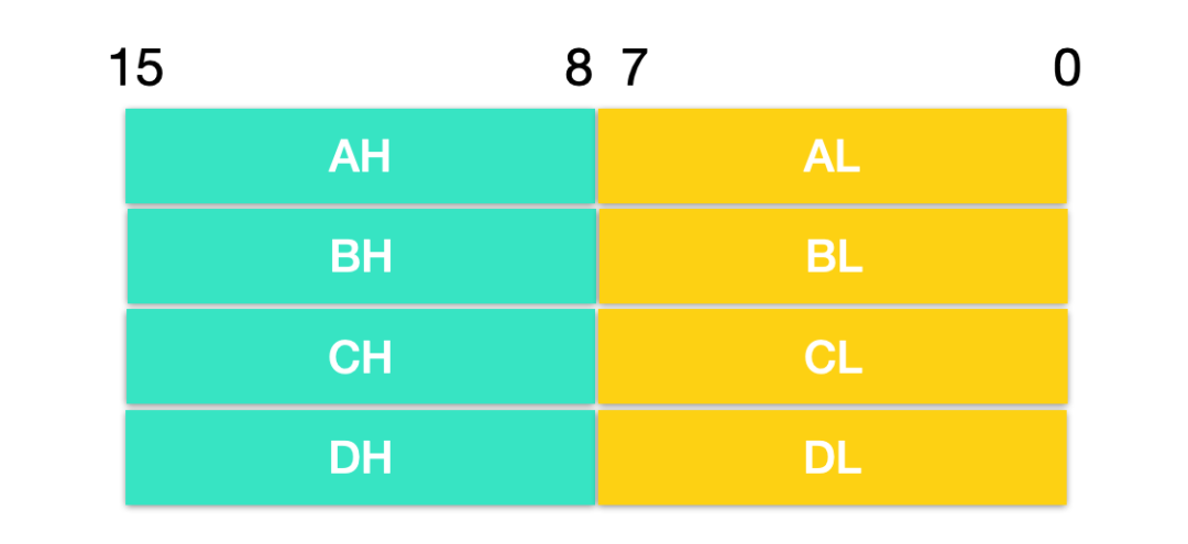 8086 CPU 的上一代寄存器是 8080 ,它是一类 8 位的 CPU,为了保证兼容性,8086 在 8080 上做了很小的修改,8086 中的通用寄存器 AX、BX、CX、DX 都可以独立使用两个 8 位寄存器来使用。