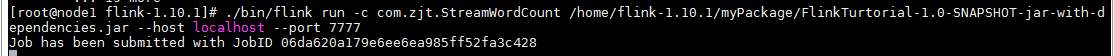 ./bin/flink run -c com.zjt.StreamWordCount /home/flink-1.10.1/myPackage/FlinkTurtorial-1.0-SNAPSHOT-jar-with-dependencies.jar --host localhost --port 7777